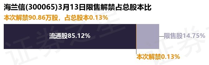 根据市场公开信息整理,海兰信(300065)(300065)于3月13日将有90.86万股限售股份解禁上市,为公司股权激励限售股份,占公司总股本0.13%。本次解禁后,公司还有1.07亿股限售股份,占总股本14.75%。具体如下图所示: